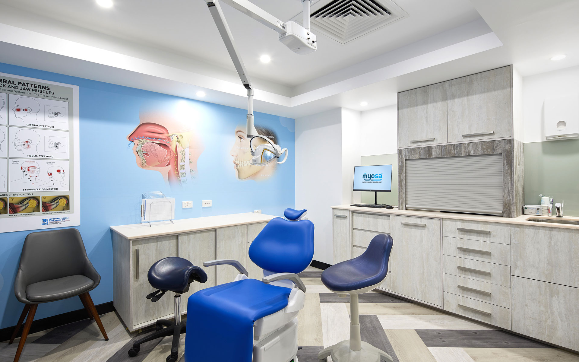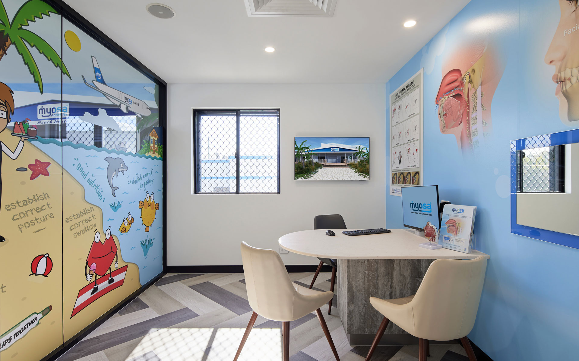 Coupled with a modern approach to treatment, the overall experience at the Myosa® Centre located at Helensvale on the Gold Coast (opposite Movieworld) is quite unique. Custom artwork throughout the spacious centre creates a motivating and engaging learning environment, while interactive touchscreens are used as teaching aids for educating patients on techniques for improving breathing and oral function. Every aspect of the Myosa® Centre has been designed with the patient in mind, allowing the best possible opportunity to reach your treatment goals.